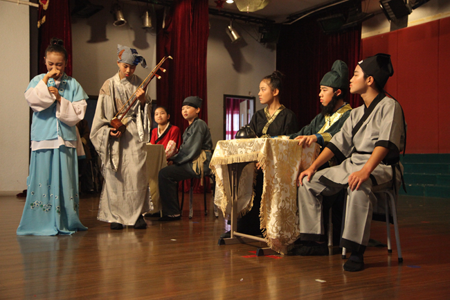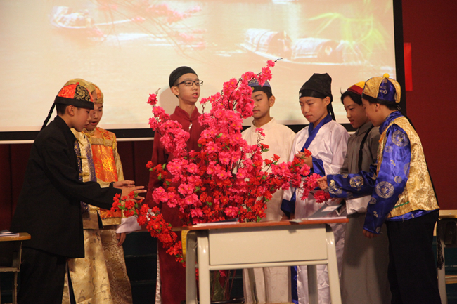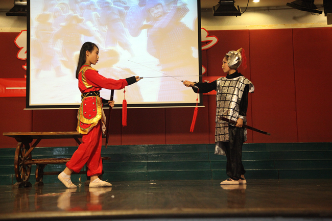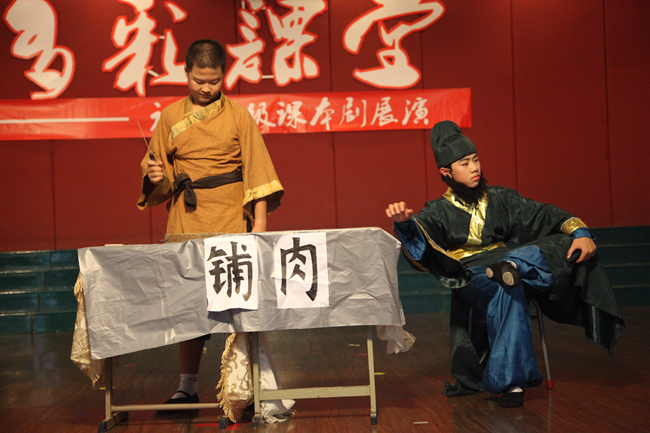 (1)(2)班的《鲁提辖拳打镇关西》,把英雄好汉的豪放大气,打抱不平的英雄气概淋漓尽致地展现在我们眼前;(3)(4)班的英雄“花木兰”更是“巾帼不让须眉”,他们演绎出木兰不仅有替父从军的勇敢,更有一份女子的温柔细腻,令观众赞不绝口;(5)(6)班表演的“三味书屋”更是别有一番风趣,新颖的开场给观众们留下了深刻的印象;(7)(8)班的《范中进举》不仅给我们带来了有趣奇异的故事,而且演员高超的演技还给我们带来的欢乐以及对故事的思考;(9)(10)班的《致生命》是此次表演中唯一的非古装戏,特别的题材带给我们的是深深的感动和对生命的思考与感悟;(11)(12)班的《荆轲刺秦王》情节跌宕起伏,再加上同学们生动的表演,台下的观众都不觉为这精彩的表演而渍渍称奇。