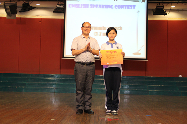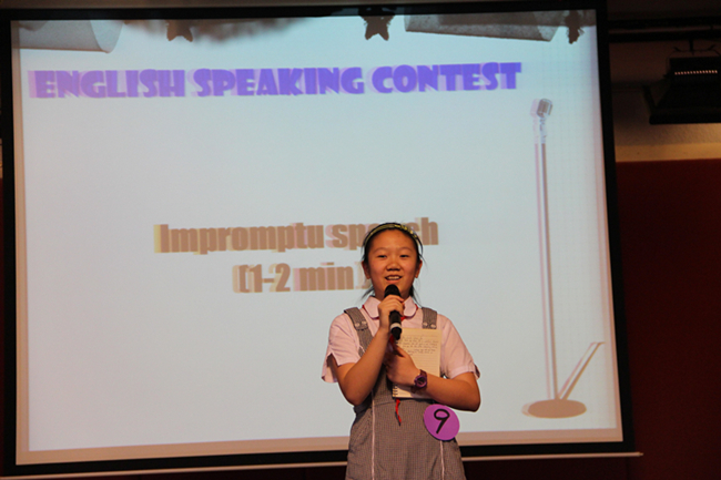 经过了一轮的回合,伴着一首What makes you beautiful的大合唱,选手们在后台稍作休息后,进入第二轮英语口才大比拼——即兴演讲。每一位选手在抽到演讲题目后只有1分钟左右的时间做准备,然后针对所抽题目进行1~2分钟的演说,挑战难度明显加大。主题各不相同,但选手们表现出的镇定、从容是台下观众有目共睹的。无论是情感类的主题如关于即将到来的母亲节Mother’s Day,论述性的主题如动物是人类的好朋友animal is human’s best friend,还是说明性的主题如对深圳的简短介绍a brief introduction to Shenzhen,选手们都能很快切入重点,积极演说,紧扣主题,娓娓道来。节奏上比定题演讲缓慢,但从一定程度上更真实地展现了初一学生组织语言的能力、词汇量的积累、临场应变以及快速反应思考的能力。