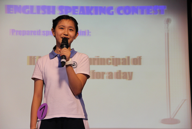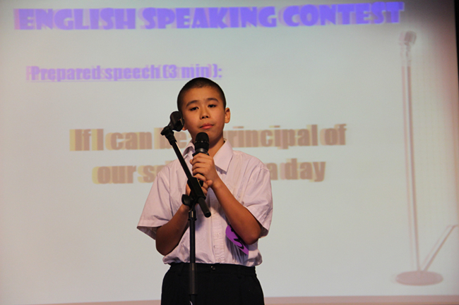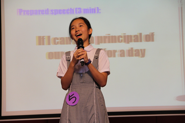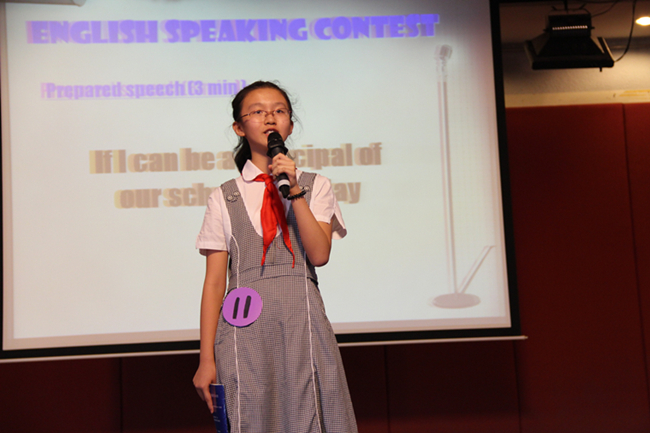 随着主持人活力四射的开场白,代表各班的总共十二位选手陆续上场。演讲共分为两轮,第一轮是定题演讲,每个选手须围绕指定题目“If I can be the principal of our school for one day…”进行2分半到3分钟的演讲时间。因为是指定题目,同学们早在一周以前就开始准备,可以看得出来每个小选手在台上都自信满满。那稚嫩的脸上写着激情和活力,嘴里蹦出的流利的英文单词就好像不同的音符,抑扬顿挫,编织在一起犹如一首首悦耳动听的歌曲,那举手投足之间凸显了小小演说家们化身为校长的魄力。选手们各抒己见,有的说,如果当学校一天的校长,会给学生们减轻作业负担或者给学生布置不一样的新课堂;有的说,如果当学校一天的校长,他会深入到学生里面去,跟学生对话;还有的说,如果当上校长,就会给学生们创造机会进行职业体验,孩子们可以模拟扮演老师、清洁工、司机、厨师等等。各种创意和点子层出不穷,发挥了极大的想象力,也让孩子们在用英语大胆表达想法的尝试中过足了瘾。