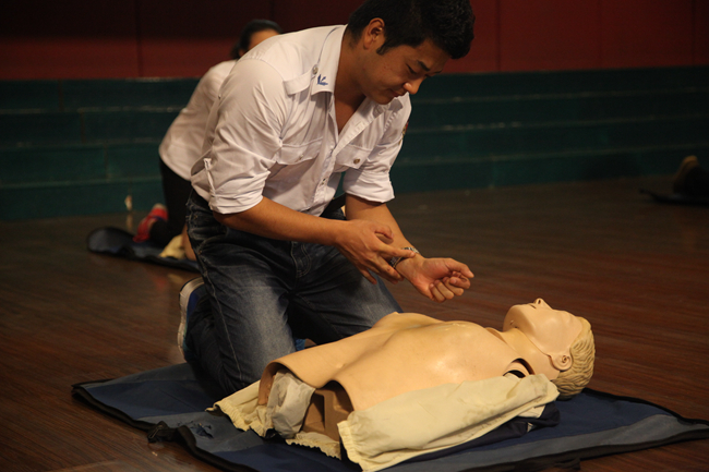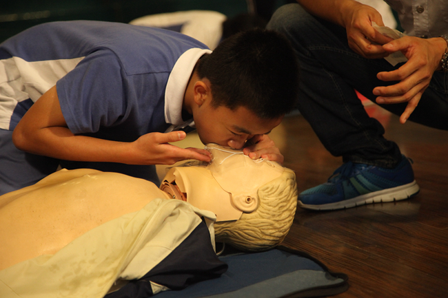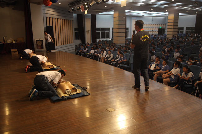 赵伟主任由大家日常生活的前提——活着讲起,讲到了生命的宝贵与脆弱引发本次讲座的主题。接着赵主任举出了许多生活中的实例,指出了现场急救的重要性、目的和原则,特别强调正确施救的程序,概括为ABCD四部曲,即A(Assessing)评估现场环境,确保自身安全;、B(Beginning)开始快速识别,作出初步判断、C(Calling)尽快呼救和求助,拨打120电话和D(Doing)迅速行动,采取可行的急救措施。讲座的核心内容现场抢救措施,是最具吸引力,也是运用非常广泛的的徒手心肺复苏术。赵主任对于徒手按压、徒手开放气道和口对口人工呼吸的每一个步骤讲解详细而且清晰,与此同时培训科的老师们在台上也用他们的不俗实力向大家一次又一次展示了近乎完美的心肺复苏的操作。之后同学们现场模拟施救环节将这次活动推向了高潮,赵主任分别模拟了由于备考压力导致昏迷、宿舍不小心触电导致昏迷和篮球比赛,运动不慎导致昏迷的三个场景,邀请了多名学生代表进行模拟施救。同学们兴致勃勃,并在急救中心的老师耐心指导下,完成了徒手按压、徒手开放气道和口对口人工呼吸一系列现场急救工作。最后讲座在以现场急救知识为内容的轻松生动的卡通片中落下了帷幕。