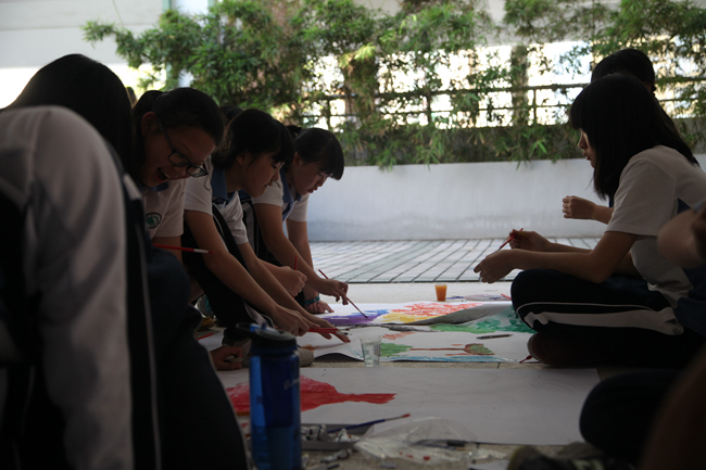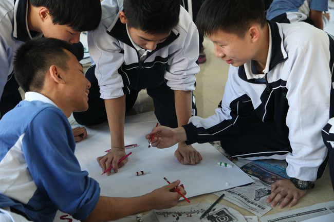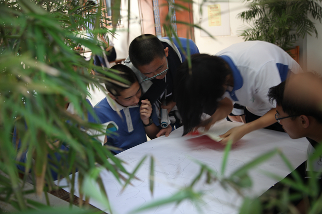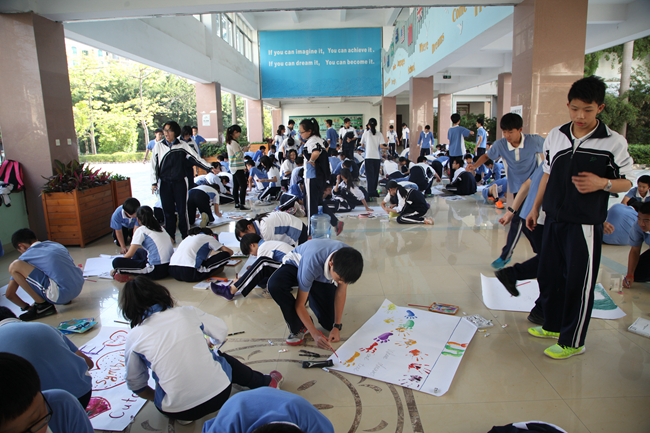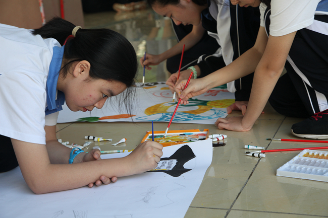 有的班级画的是百外的各种特色节日,一支支巧笔将节日中热烈的气氛细腻地描绘了出来:美食节中的佳肴令人垂涎三尺,科技节的环保时装秀令人目不暇接,体育节健儿们的身姿令人拍手叫绝。同学们将自己对百外的深挚感情融入画中,让一幅幅美妙绝伦、栩栩如生的精致图景诞生。同学们分工合作,有的打草稿,有的描线,有的上色,忙得不亦乐乎。有的同学为了画面更加完美,甚至跪在画纸旁,一笔一划地仔细勾勒。活动现场气氛热烈,一张张铺在地上的白纸不一会儿就被渲染上了美丽的色彩。