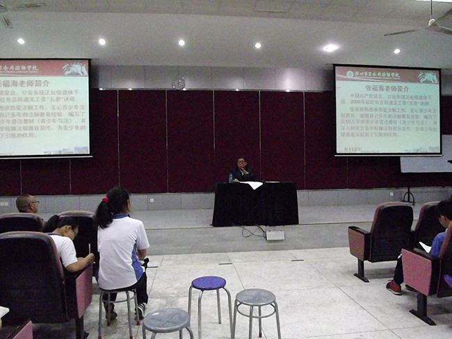 4月12日晚七点,我校全体初一师生在二楼礼堂聆听了一场生动有趣的讲座。这次讲座的主讲人是曾任警校校长,致力于法制工作的张福海老师。讲座由学校安全处主任王敖老师主持,初一年级李俊义主任和所有班主任及学生聆听了讲座。