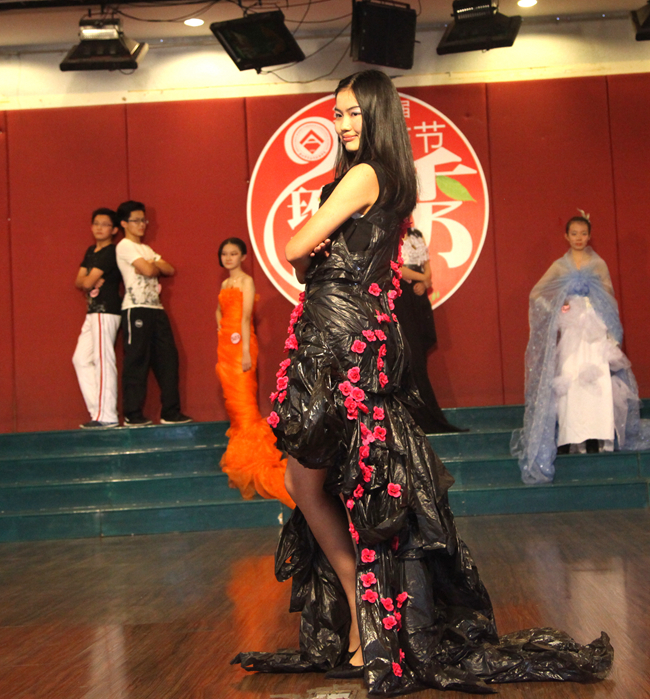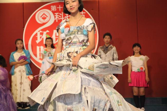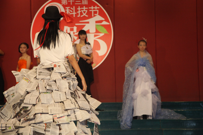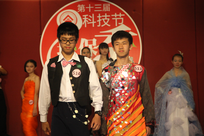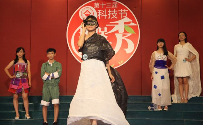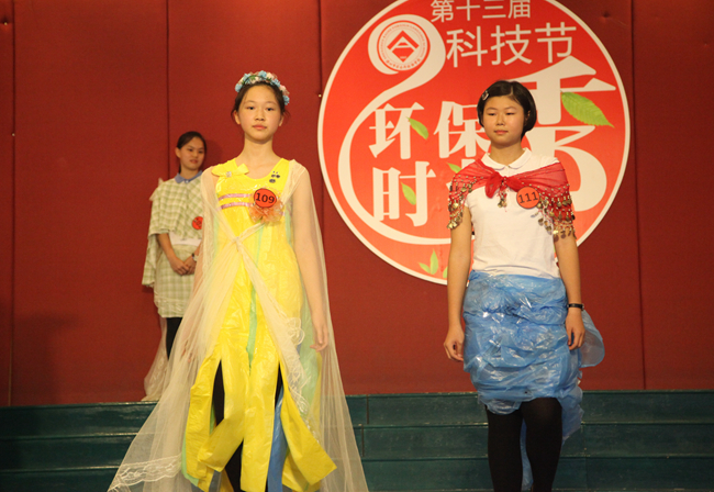 我校第十三届科技节系列活动之一——环保时装秀于3月31日下午16:00在六楼礼堂举行,初二年级五个班级组代表设计师们各显其能,设计加工出了一件件别具一格的服装,穿上特点分明的服装的学生模特们自信、大方的在舞台上展示了各自的风采。与我校提倡的“张扬青春个性,展示自我创意,增强环保意识,共建低碳校园”的主题不谋而合。
