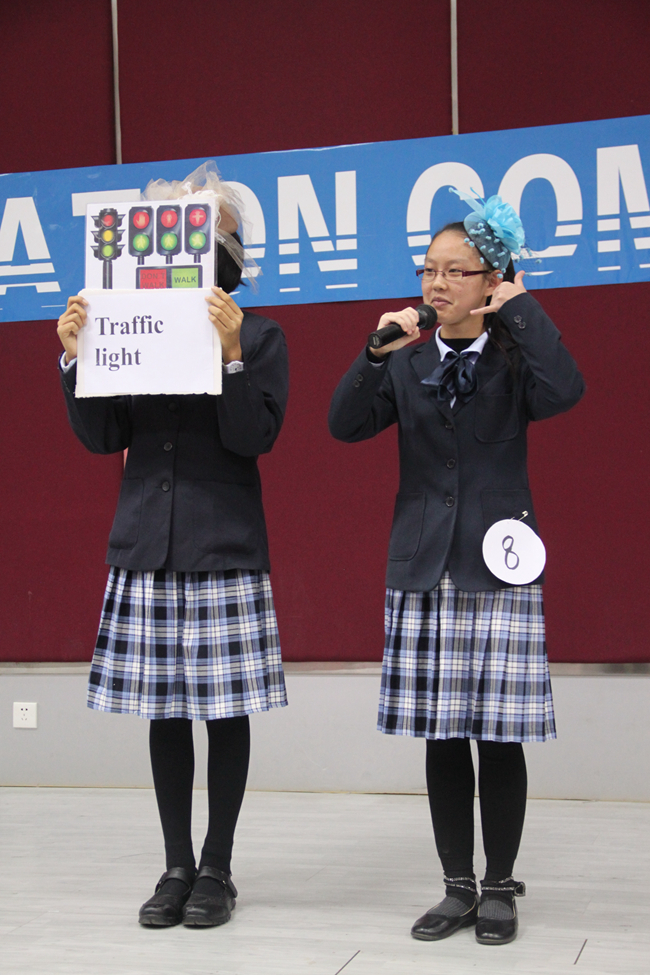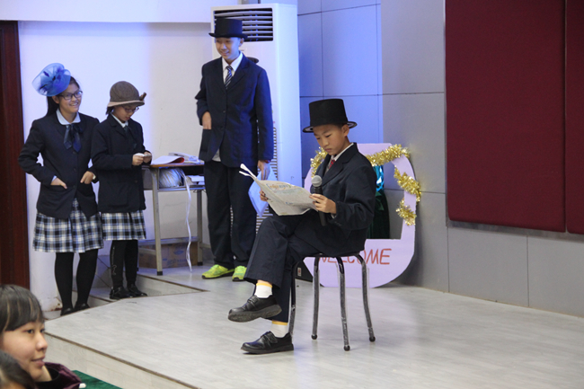 首先出场的是初一10班,表演内容是ATTT的program3。一开场台下的学生观众们就被Tamara的角色吸引住了,表情丰富,声音沉稳,语调抑扬顿挫,听起来很流畅,最重要的是她那甜美的笑容,塑造了一个全新的富有活力的Tamara。与她对话的路人甲则是男扮女装,戴了假发和边框眼镜显得滑稽而有趣,令人捧腹。紧接着是初一7班,3班和11班依次亮相,表演的内容分别是Program1,4和2。当表演部分的开场音乐一响,台下的同学们都抬起头睁大着眼睛,聚精会神地注视着台上的每一个小演员,伴着熟悉而又轻快的音乐旋律,大家也情不自禁地唱起来,真是激情澎湃!尤其是Program4 International Coffee Shop,韵律简单好听朗朗上口,大部分学生都能脱口而出,每个人脸上都洋溢着喜悦的笑容。台上扮演4个Waiter的小演员,每个人设计了不同的肢体动作和准备了不同的道具,他们用浑厚独特的男中音生动形象地展现了书中waiter的人物特点。接下来,表演program1的还有初一4班和12班,表演Program2的还有初一11班,5班和8班,表演Program3的还有初一9班,而表演Program4的还有初一6班和1班。每一个班都几乎用非常个性化的方式丰富了原来的人物对白和情景设置,各具特色。比如,有的把What a beautiful day的歌词改编成了圣诞歌曲,十分新颖而有创意;有的加入了两人互动的舞蹈动作,简单而有趣;有的准备的非常充分,把情景对话中涉及到的所有场景标识做成了道具,让真人模拟声效(譬如大象的叫声,电话铃声等),栩栩如生地再现了书中的场景!同学们流利的口语,标准的发音,充满自信的表情,独具创意的表演,都给大家留下了深刻的印象。