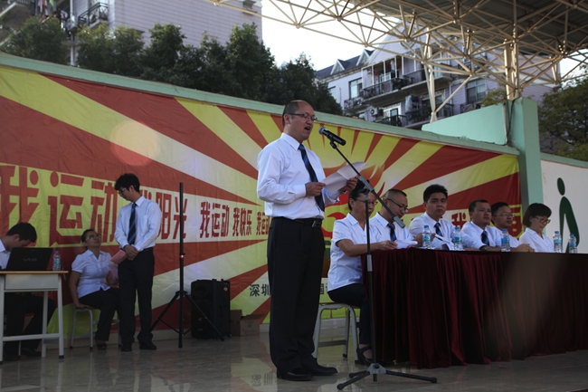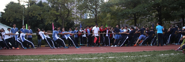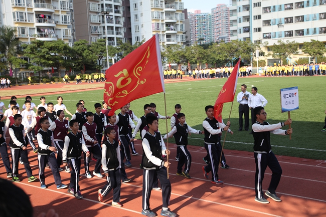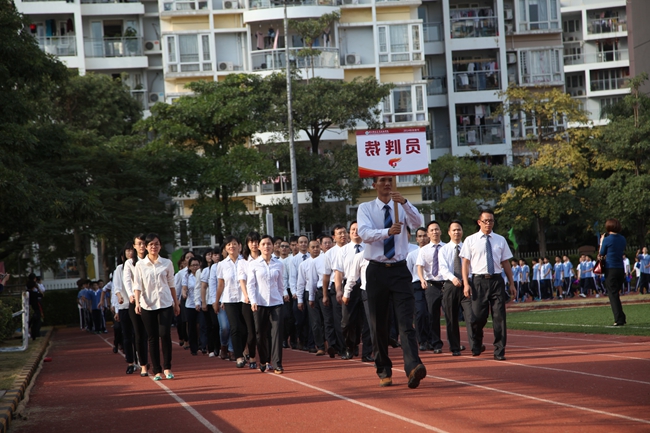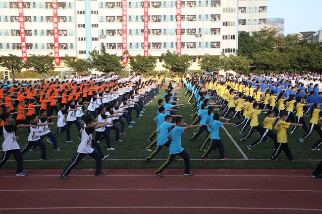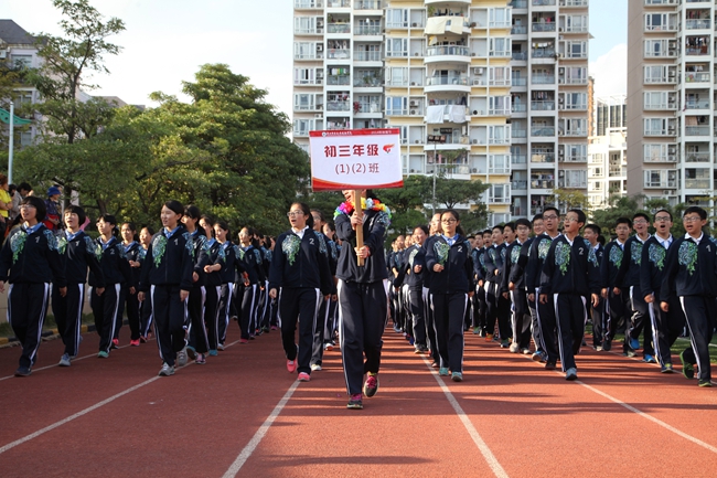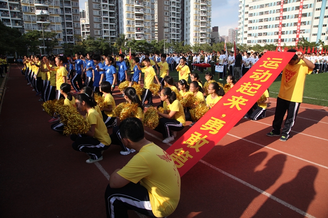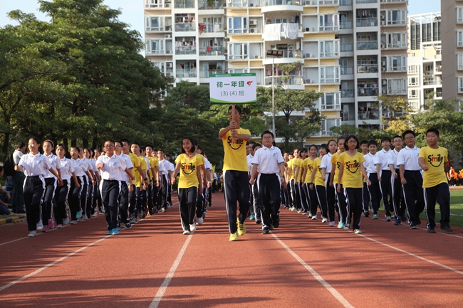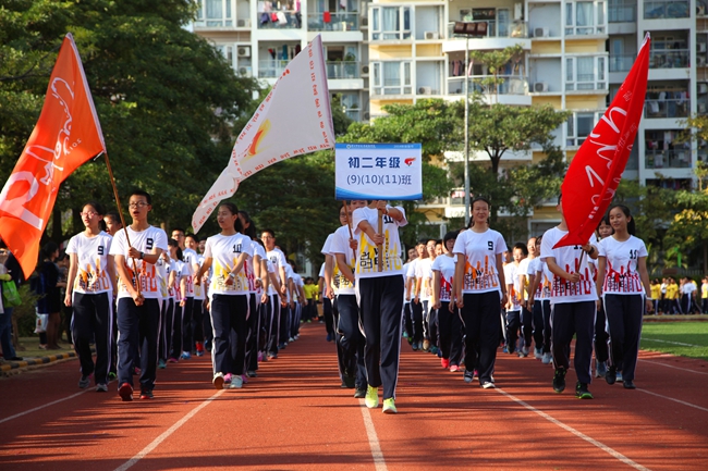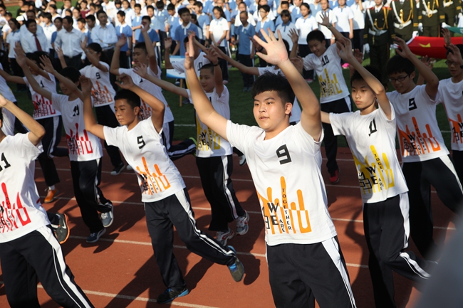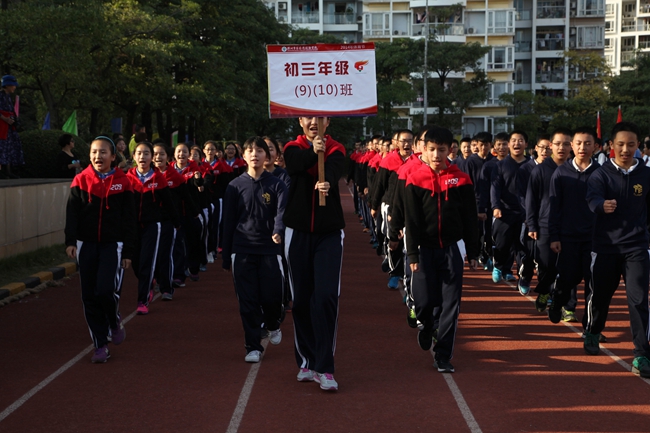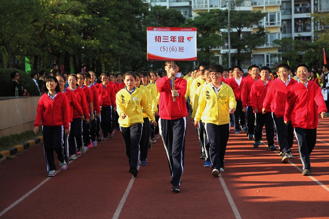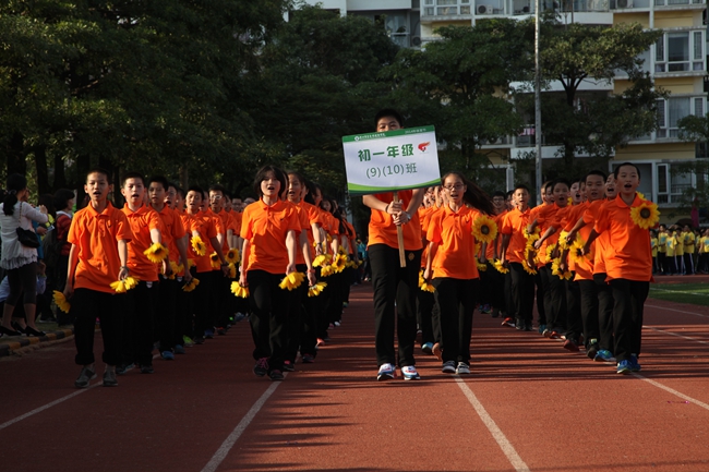 下午下第一节课后,各班级的同学在班级组老师和体育老师的指引下,迅速有序地到达了操场指定地点集合,为入场式做好了准备。3点整,姜主任宣布了2014年体育节开幕入场式开始,国旗队、校旗队、会徽队、红旗队、教师裁判队伍踏着《运动员进行曲》的音乐节奏,迈着整齐的步伐首先入场,接着,初二、初一、初三年级的方队分别入场。初二和初一年级同学们在入场式表演中,展示了优美的舞姿与积极阳光的精神风貌,也向我们展现了他们的班级文化。初三年级的同学们铿锵有力的步伐和嘹亮的口号,充分体现出了他们力战群雄的气魄。入场式结束后,还举行了升旗仪式。朱正兴校长为开幕式致辞,并宣布了体育节正式开幕,体育组王勇波老师和初三(5)班李宗瑾同学分别代表裁判员和运动员宣誓。在代表们宣誓之后,展示年级风采的时候到了,初一年级和初二年级的全体同学为大家带来两场军体拳表演。初三年级的拔河比赛更是势均力敌中争高下,让大家亲眼验证了“群雄争霸”,最后初三(1)班卫冕冠军。最后,学校老师们分成初一、初二、初三和后勤总政四个组,举行了趣味“袋鼠跳”比赛,同学们围着赛场形成了一个大圈,为自己的老师欢呼,在同学们兴奋的呐喊和加油声总,初一年级的老师们夺得了第一名。