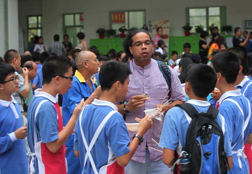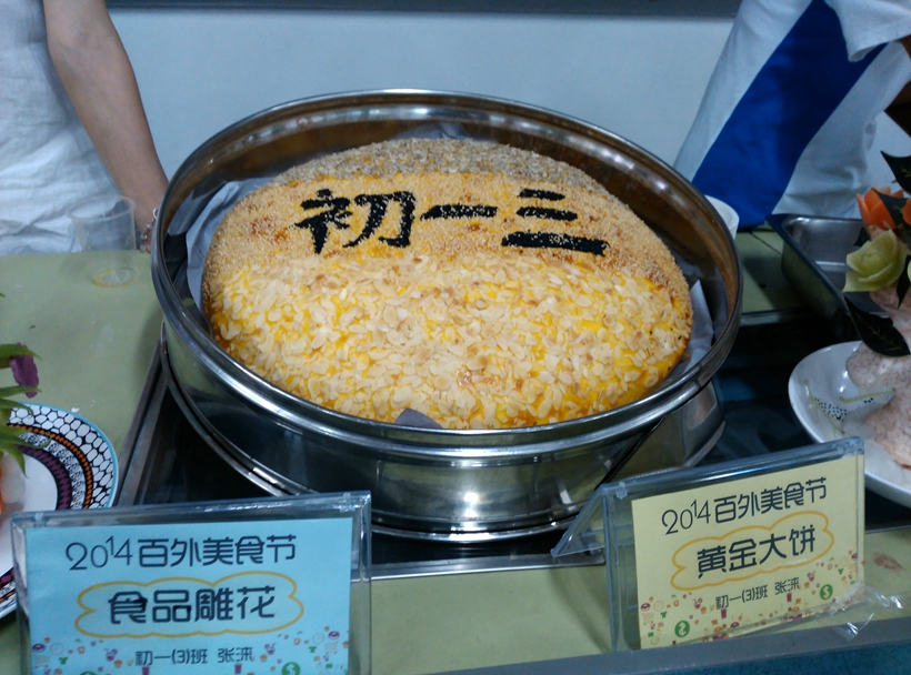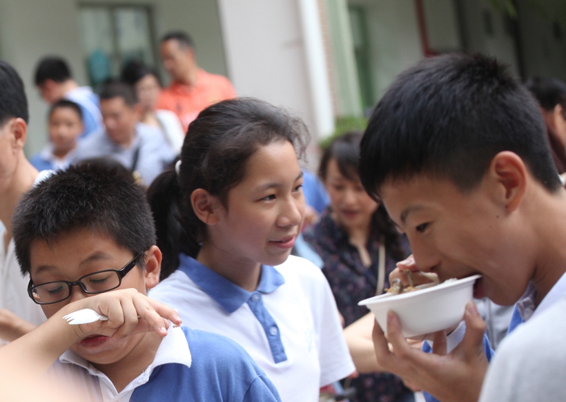 节日前期,学生处姜主任带领初一班主任反复研讨,制定活动方案,关注活动细节;家长们热心参与,积极响应,准备充分;学生们热情高涨,万众期待。节日的号角刚刚吹响,家长们还没布置完毕,初三、初二的学生已经在楼上俯首倾耳,极目远望,垂涎欲滴。出于安全考虑,三个年级分时间段进行,幸运的初一同学带着楼上学长们的欣羡和渴盼,美食之旅首先起航。各班级不仅在显著位置设置了中国各大菜系的详细介绍,各班家长也都在美食傍边标注了食材和制作方法,力图把本届美食节打造成一场文化大餐。家长们精心准备了大量美食,不仅色香味俱全,还中西兼备,像红焖大虾、五香扣肉、糖醋排骨、红烧板栗鸭等家常菜随处可见,寿司、沙拉、披萨、意粉也应有尽有。最受欢迎的要数烤全羊和酥油茶,炎热的深圳仿佛也吹来了西北的民族风情。更有家长专程请来拉面师傅现场表演绝活,看着上下翻飞的面条配合柔韧灵巧的舞姿,学生们爆发阵阵掌声。亲手制作蛋糕的环节也让孩子们体会到了制作美食的乐趣,在食品当中体会到了艺术的魅力。本届美食节不仅是“吃货”的乐园,更是文化的盛宴。