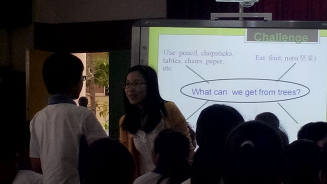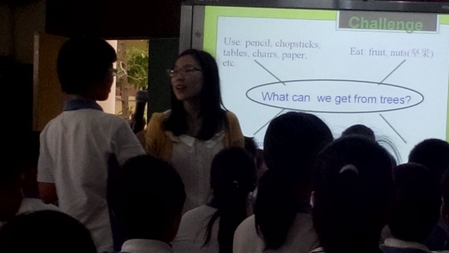但我校赫老师带去的课也自有其特色:以“地球保护日”为导入,引发了学生对树木重要性的思考,然后通过小组间的竞赛进一步了解树木在我们日常生活中的作用及重要性,紧接着图片的展示让学生们意识到保护树木的必要性,用4R(Reduce, Reuse, Recycle & Respect)告诉学生如何付出行动,再配上精心准备的视频,让学生感受到了保护树木可以从身边做起、保护地球人人有责的理念,达到了情感的升华。赫老师上课语音纯正、指令清晰,整个课堂如行云流水般顺畅。她的讲课技巧和个人魅力不但征服了学生,也征服了在座的老师。