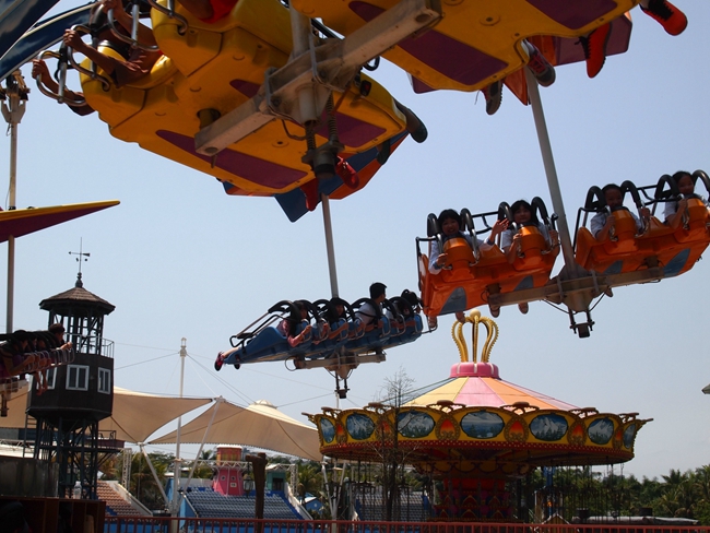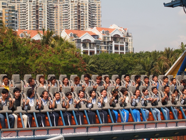 行程的第二站是首批国家AAAAA级旅游景区---深圳欢乐谷。天公作美,出门时还有料峭的春寒,而到了景点,艳阳高照,学生们都像脱笼的小鸟,导游老师一声解散后,就三五成群地奔向了自己喜爱的娱乐设施旁去排队等候了。