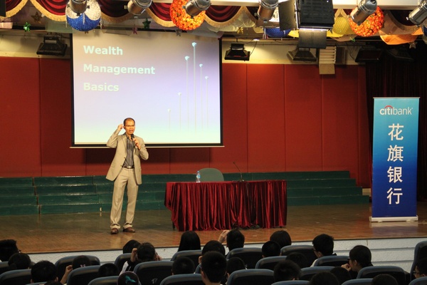 讲座第一部分由花旗银行南区投资顾问主管吴晶晶主持。作为深外高中部毕业的优秀学子,吴小姐用中英结合的方式给同学们讲解了一些基本的理财知识,比如投资与理财的区别,理财的目标与规划,投资者的心理等。她丰富的专业知识和深入浅出的讲解让在座同学受益匪浅。