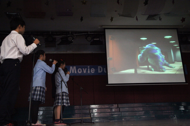 此次活动以班级为单位,经过了初期的选拔,每个班级都派出了最有实力的选手来参赛。电影的种类也涵盖了卡通片、侦探片、歌舞片、科幻片等。初二(7)班同学以惟妙惟肖的声音演绎了美国动漫《Rwby》,为此次活动拉开了序幕。随后,《Harry Potter》、《Monster INC》、《Despicable Me》、《Ice Age 4》、《Rise of the Guardians》、《The Chipmunks》、《Sherlock》、《High School Musical》等影片悉数上演,同学们的热情也被台上选手的精彩表现一次次地点燃。