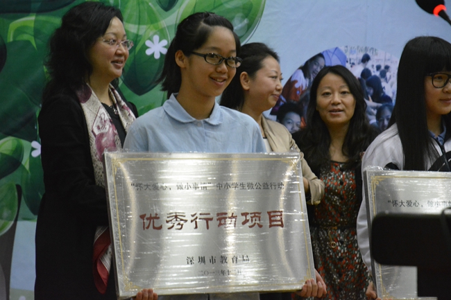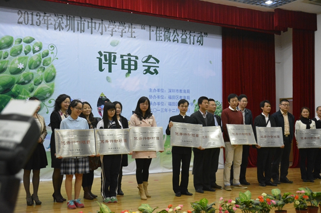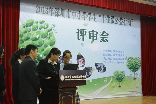 12月11日下午,我校初二(5)班巫千仪、余滨同学和学生处姜主任、邱老师、蒋老师一起,到福田区南华中学参加了“2013年深圳市中小学生十佳微公益行动”评审会,并获得了“优秀行动项目奖”。巫千仪、余 滨、陈 诺等十名同学获得了微公益之星称号。本次评审活动,我校把历年来参与关爱自闭症活动成果集中展示,获得了一致好评。我校一直以来,把公益做成教育,通过一系列的爱心活动,取得了很好的德育效果。