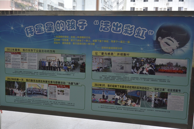 2012年元旦节,我们学校五六百个同学和老师,家长,与华侨城酒店、深圳自闭症研究会一起组织开展了“为爱飞奔”爱心长跑活动。当时我们为自闭症患儿一共募得了13万元善款。去年3月29号,我们学校承办了 “彩虹之家”社区邻里节。当时我们集会全校的同学都参与了活动,通过游戏有体验自闭症儿童的生活情况。去年4月2号,我们的同学和老师又去参加了关爱自闭症的展能运动会,也是和自闭症的孩子一起开展活动,游戏,来帮助他们治疗。伴星星的孩子活出彩虹这一活动,折射出来的是一种德育效果。通过一次次大小小小的公益活动,让我们的学生都有了这种公益的习惯。我们学校每年都要举办一到两次的跳蚤市场爱心义卖活动,每个学期大家都会把看过的书集中起来,邮寄给给贵州、云南等贫困山区的学校,帮他们建图书馆,有的同学还在假期去贫困地区,和贫困地区的学生进行一对一的帮扶。今年3月30号早上6点多钟,我们一百多个同学和老师家长,再一次参加了 “为爱飞奔”爱心长跑活动。这天还下了雨,但是活动也很成功。今年4月23号,我们学校承办了壹基金的“第三届社区邻里节”。那次活动是我们初三的三个同学策划的,取得了很好的效果,当时一个自闭症的小孩还给我吹葫芦丝,给大家的印象特别深刻。