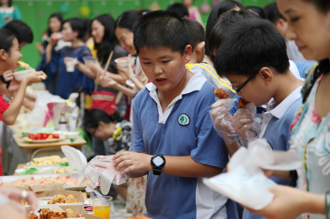 活动开始前,初一年级的老师、同学和家长们就做了大量的准备工作——老师安排工作,并和同学们一起精心布置教室;家长们采购食材,并准备好制作食品所需的工具。下午4点,家长们陆续到校,与老师和同学们一起,在教室设定了食品制作区、取食区、用餐区等区域,并把成品美食摆放到位,也有的家长开始现场自己制作或者教同学们制作美食。卤菜、寿司、披萨、肉丸、蛋糕、炒饭、粉面等,全年级的美食不下百种,馋得同学们像游戏中的“贪吃蛇”,再多也吃得下。同学还利用手中的美食券,到其他的班级去品尝分享他们的美食。初二的很多同学都按耐不住,加入到了“贪吃蛇”的行列,主办班级也非常好客,大方的贡献美食,有的班级还安排有小节目,以欢迎来“来宾”们的到来。有的同学跟着家长现场学习制作菜肴,看品尝的同学们的那开心的表情就知道,这肯定是学有所成的。活动一直进行到6点多才结束,同学们和老师、家长一起,把场地收拾得干干净净,没有留下任何一点垃圾。