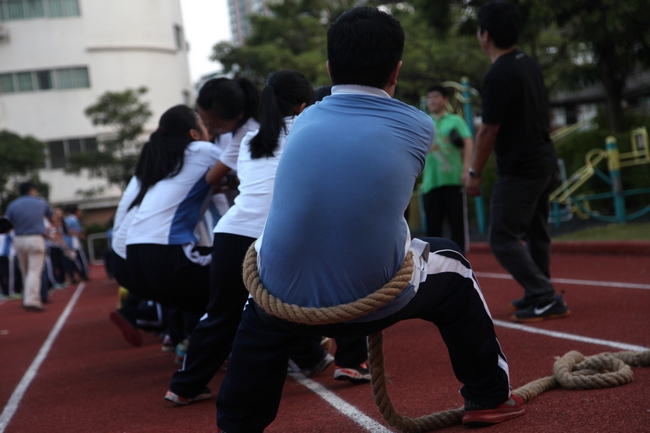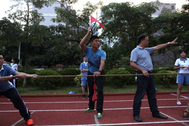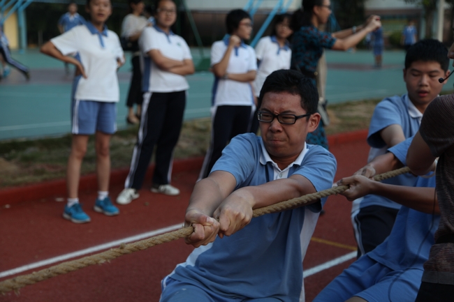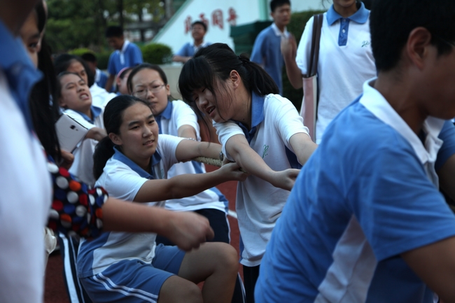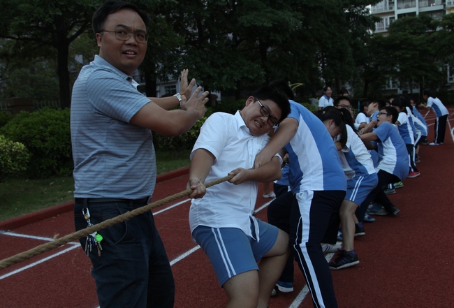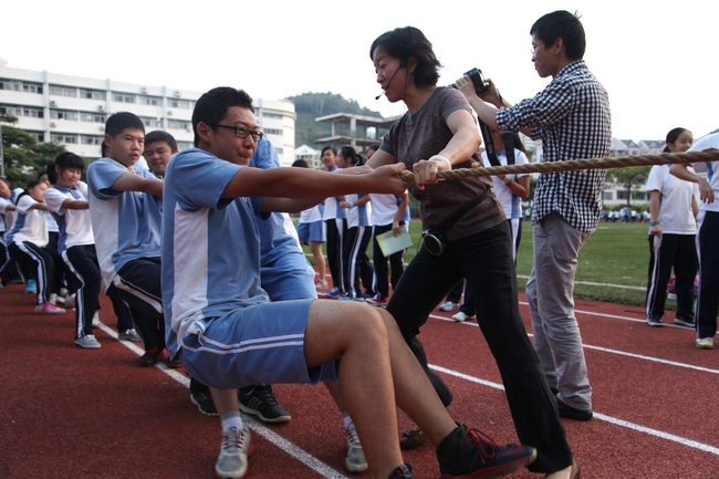 激动人心的拔河比赛开始了!双方队员紧紧抓牢手中的绳子,齐心协力往后拉。热情的啦啦队在场外高喊着“加油!加油!”震耳欲聋的声音此起彼伏。在这紧张时刻,队员们咬紧牙关,使尽全力,奋勇拼搏。有的队员手和脸都拉得通红,有的身体倾斜就快躺到地上去,有的眼眶都湿润了,可是仍然含着泪,咬着牙,坚持着,丝毫不松手。每一个班级的参赛队均全力以赴,赛出了顽强的精神、团结的风尚!场场比赛牵动着老师们的心,学校领导、班主任老师、任课老师纷纷在旁加油助威,呐喊声中,师生融为一体,师生的心贴得更紧了……