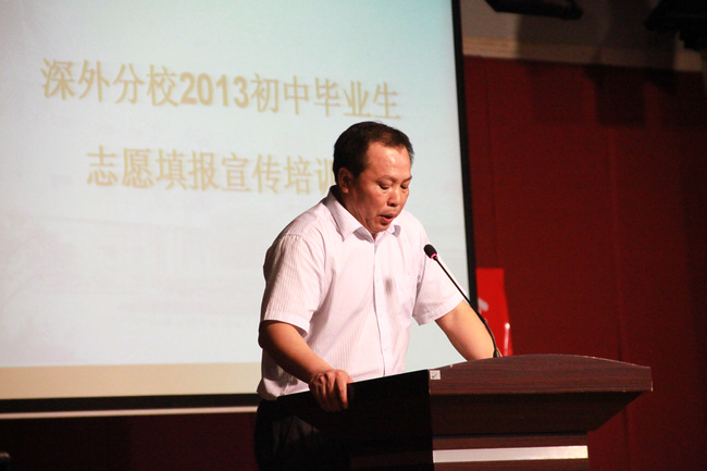 2013年5月28日晚19:00,学校在六楼礼堂组织初三全体家长和学生召开了“2013年深圳中考志愿填报说明会”。深外汤佳宏校长、高中部罗副校长、2012年高三年级主任石老师、优秀学生代表李水无拘出席了此次会议。