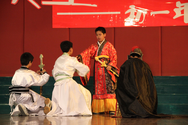 首先登台的是初一(9、10)班组的《皇帝的新装》,同学们用课本中的童话故事结合现代的演绎技巧,幽默的表演乐得观众前俯后仰,赢得了全场欢呼;初一(3、4)班组的《变色龙》,表演的同学完全投入到了角色当中,配上故事所在年代的服装,让大家感觉到真实的故事就在眼前发生一样;《范进中举》由初一(1、2)班组的同学来演绎,他们大胆的动作和生活化的对白,把故事再一次真实的展示在了大家面前;初一(5、6)班组的《羚羊木雕》,那些校园生活的场景,天真无邪的友谊,搭配上讴歌青春的音乐带给大家阵阵感动;初一(7、8)班组的同学们上演的《杨修之死》则完全根据课本所写的故事来演绎,服装的调配,各个角色鲜明的性格展现,完全不下于电视剧中专业演员的表演技巧。最终,年级杜主任为本次活动做了精彩的总结。