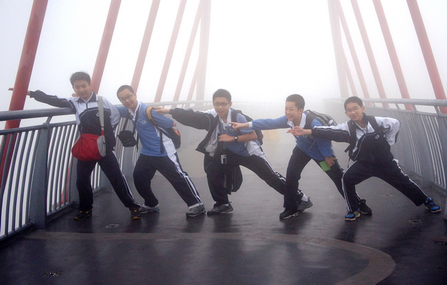 回到大自然,同学们像小鸟一样,自由的飞向四面八方,我随着一部分同学一起,从东面的峡湾栈道往上,开始参观。走完了栈道,一帘又高又宽的瀑布坠入眼眸。也许我们来得太早,瀑布还没有水流,但是这壮观的场景已经让我们感觉到了它宏伟的气势,很多同学们在这里拍照合影。往上走,我们经过了海菲德小镇,沿着大坝似的道路前行,来到了森林广场。广场上竖立着几个巨型鸟笼,里面饲养着鹦鹉、八哥和孔雀。很多同学抵挡不住童趣乐园的诱惑,早已在那里“大展身手”了。4D影院、海上风暴和迪斯科也都可以看到同学们的身影。我们一行看完了4D电影《熊猫》之后,乘坐丛林缆车1号线,直登山顶的云中部落。“登峰造极,仙气来袭”这是登上云中部落的第一感觉,大家不约而同发出了惊叹的声音。虽说我们已经“会当凌绝顶”,但是我们并没有“一览众山小”,因为“只在此山中,云深不知处”。来到了自然之眼观光塔前,我们才发现,因为今天云多雾大,塔这里并没有开放,但是大家都亲密接触到了“雨点形成的过程”,也不枉这一行了。沐浴着迷蒙的仙气,感受着“高处不胜寒”,我们“云中漫步”,径直来到了云海索道站,乘索道向下,来到了深海探奇。我们看完了立体电影《深海之旅》之后,还没有来得及参观完水母馆,南面传来了惊涛骇浪的声响,忍不住,我们应声而下才发现,原来《咆哮山洪》表演已经开始了。表演的内容在这里我就不为大家介绍了,总结为一句话:“怎一险字了得?”