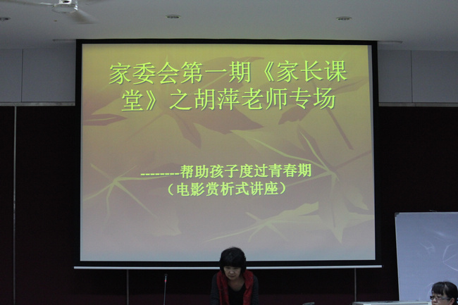 苏霍姆林斯基说:"没有家庭教育的学校教育和没有学校教育的家庭教育,都是不可能完成培养人这一极其细微的任务。"这句话强调了家庭教育和学校教育对孩子的成长是同等重要。家长是孩子的第一任老师,家庭是孩子的第一课堂。因此,2012年11月25日晚7点,我校家委会在二楼报告厅成功的为初一初二的家长组织了一场让与会家长受益匪浅的电影赏析式讲座---《帮孩子度过青春期》。