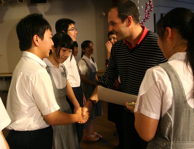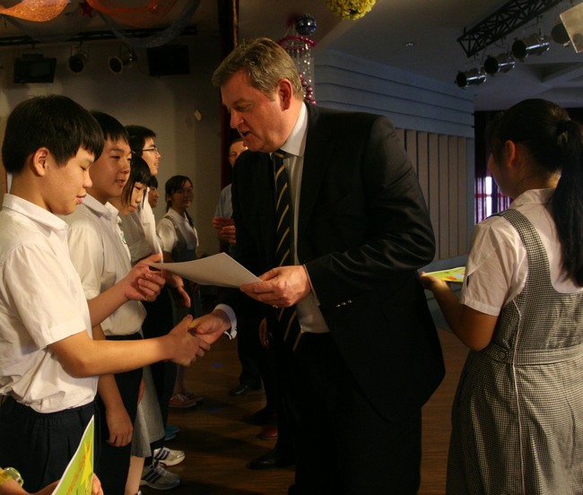 在集会上,英国校长们与初三学生一起欣赏了学生演唱的“每周一歌”,观看了校园“每周新闻”,并为获得“每周之星——友谊之星”的学生们颁发奖状。