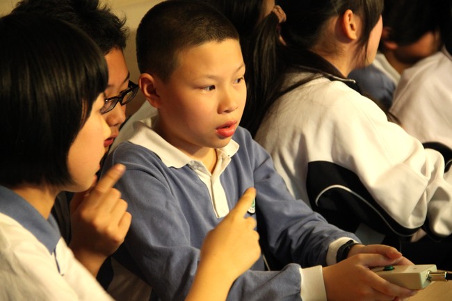初一年级的二十四位选手在台上时而沉思,时而低声讨论,答题时从容不迫,自信满满,表现出他们的睿智与敏捷的思维。在陈文宇老师、刘艳老师的主持之下,现场气氛热烈,台下学生为选手紧张,为选手欢呼,也积极参与了观众的抢答环节。