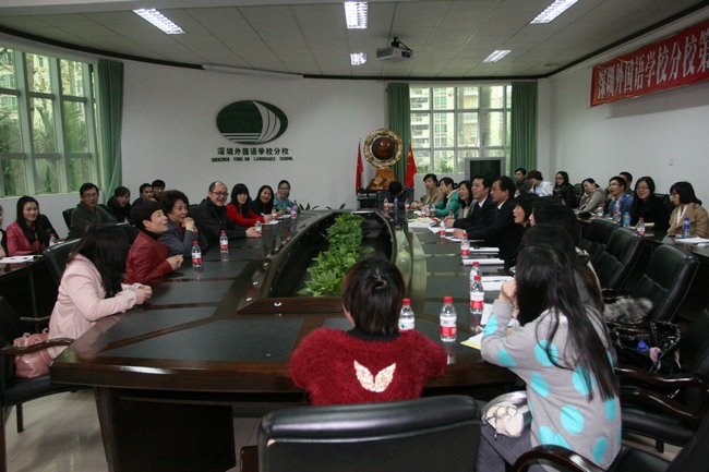 在学校会议室,邬校长向外语同行们详细介绍了我校的外语教学特色和现阶段进行的教育教学改革。她阐述了外语教师应肩负的责任:外语学校教师必须具有国际视野,但首先要拥有民族情怀,只有这样,才能培育出传播中华文化的走向世界的未来国际人才。
