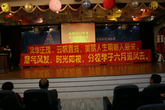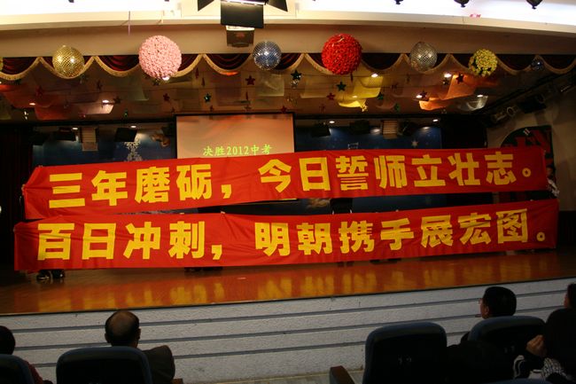 3月11日晚,初三年级在学校六楼大礼堂举行了隆重的“2012决胜中考百日誓师大会”,龚校长、邬校长、朱校长和学校各部门领导以及初三年级家委会全体委员参与了这次大会,共同见证了这一庄严的时刻!
