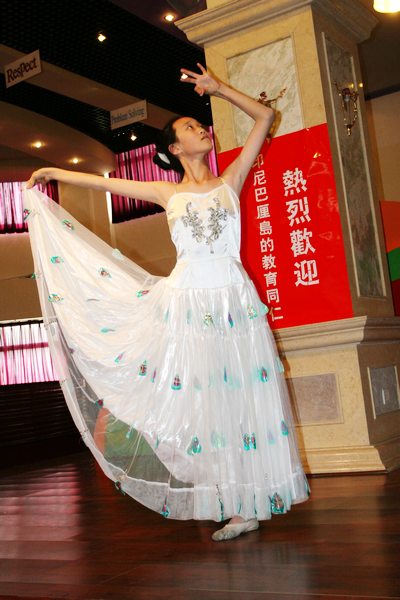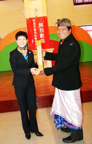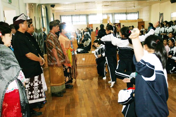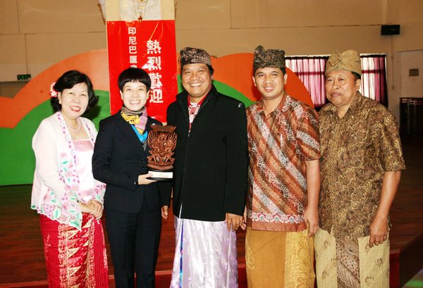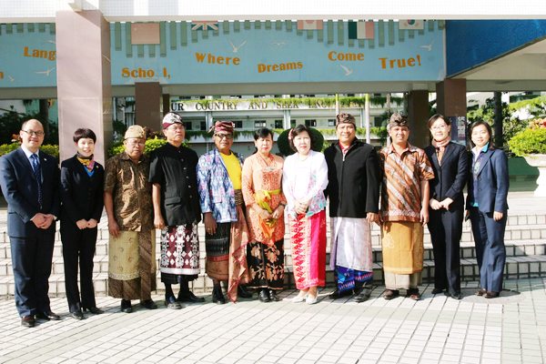 校长团一行七人,身着民族服装,在邬校长的陪同下首先参观了校园。随后,他们来到外语活动中心,参加了学校为他们精心准备的、简短而又热烈的欢迎仪式。邬校长致辞,表达了对巴厘岛友人的热烈欢迎。我校“校园小乐坊”、“校园十大歌手”获奖选手、舞蹈队的同学分别献演精彩节目,赢得阵阵掌声。
