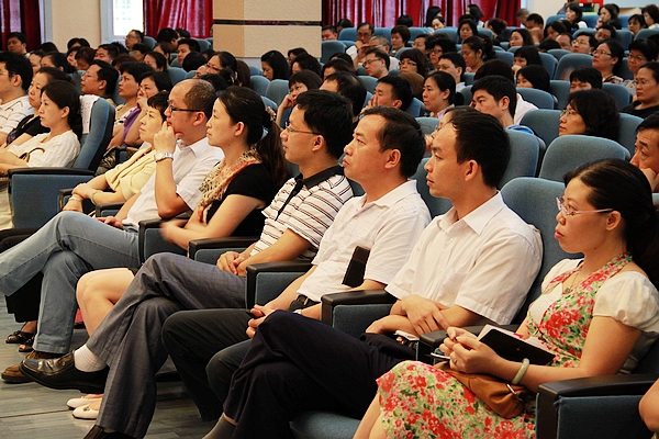 杨老师首先从身边到处是不快乐的学生说起,对比分析了我国与各国的幸福指数,接着从宗教、历史、哲学和社会现实等方面分析我们“不快乐”的原因。他通过一个个生动、幽默的故事启发大家远离痛苦,快乐生活。最后他以诗歌“我们生活在‘一个’不够的年代,有太多的欲望和追求……”告诉大家唯有摈弃欲望,我们快乐了,才能让孩子们快乐学习,快乐成长。