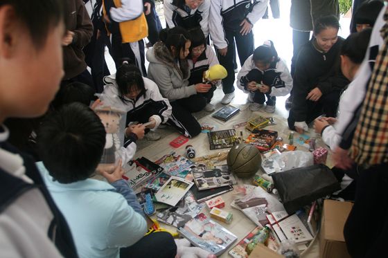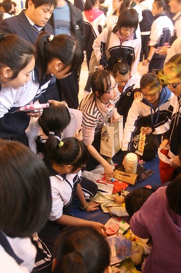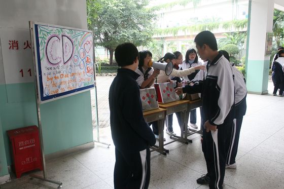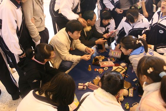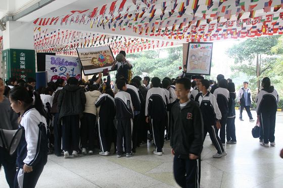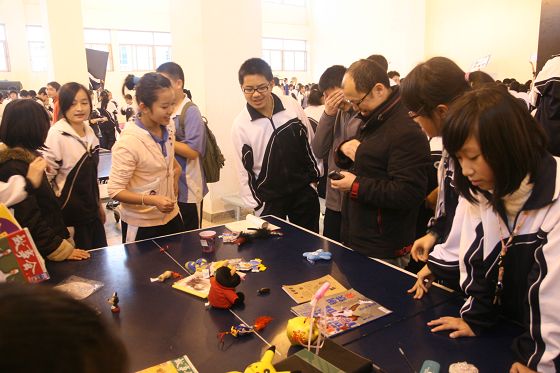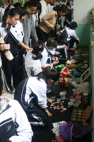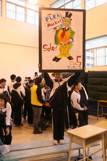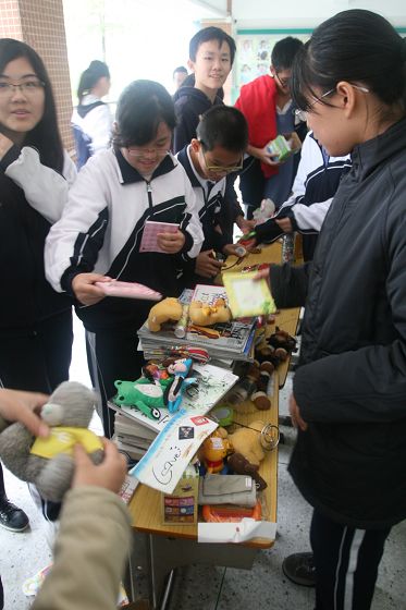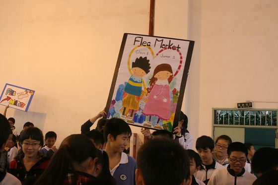 12月29日下午,学校第八届外语节跳蚤市场即爱心义卖活动火爆登场。天空中的冷雨浇不熄同学们的热情。同学们从家里带来各种书籍、文具、饰品等作为商品,用桌子当柜台,用地垫当铺位,在体育馆和教学楼走廊这个“大卖场”里,将自己的智慧写在宣传海报上,将自己的热情融进吆喝声里。