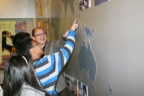 在校史室的世界地图面前“遥指”故乡