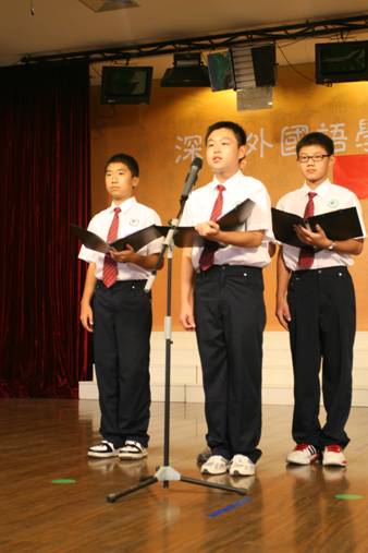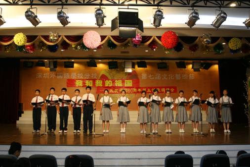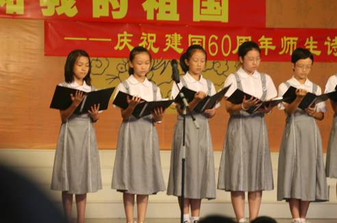 9月24日下午16:00时,深外分校六楼演艺厅时而掌声阵阵、时而鸦雀无声,庆祝建国60周年主题活动之《我和我的祖国》诗歌朗诵会正在这里进行……