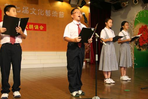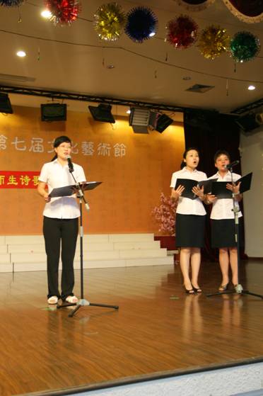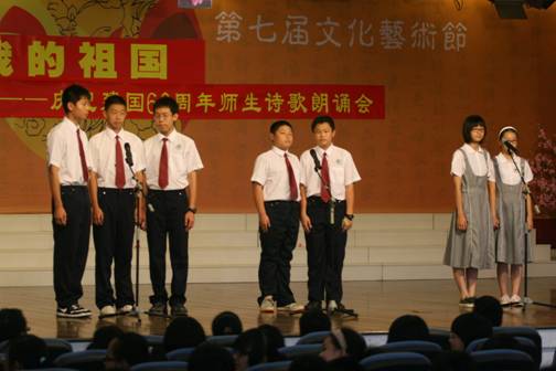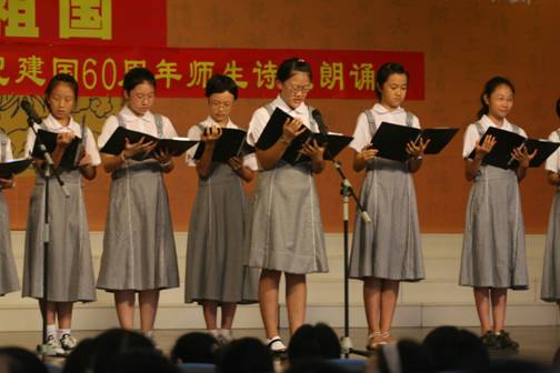 这场由语文组主办、学生处协办,共有50名师生登台的诗歌朗诵会,为庆祝建国60周年主题活动周拉开了帷幕,接下来还将继续开展丰富多彩的“我爱我的祖国”主题活动。
