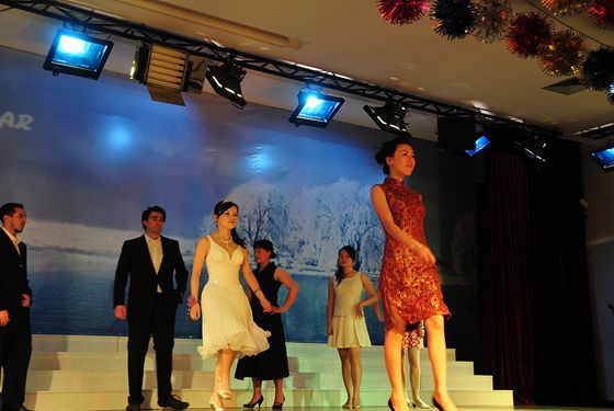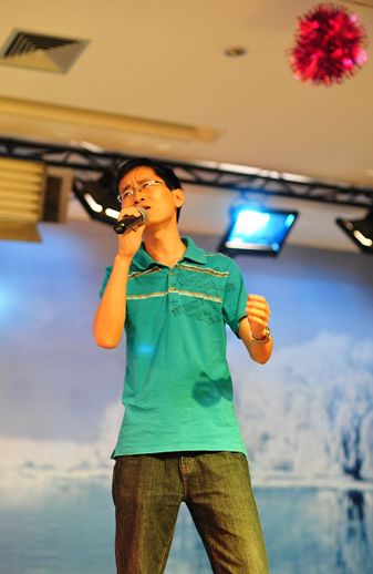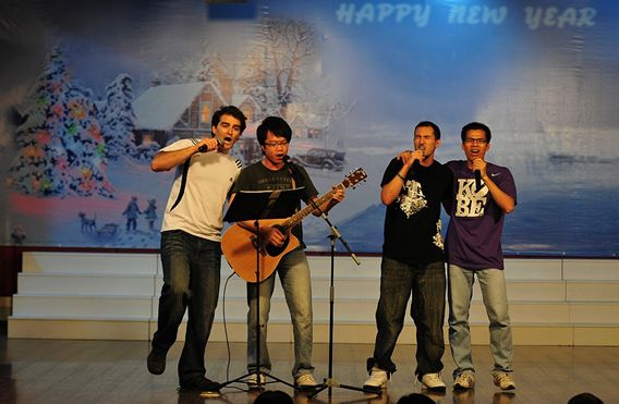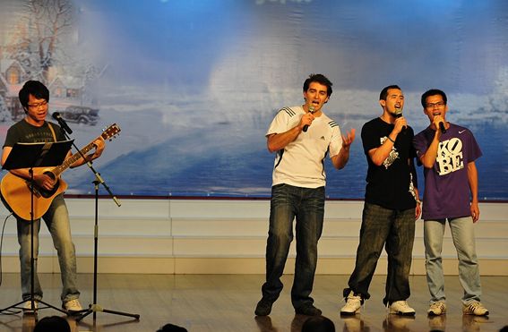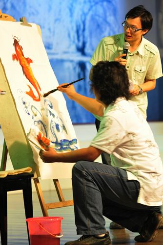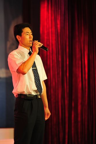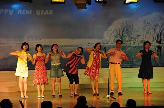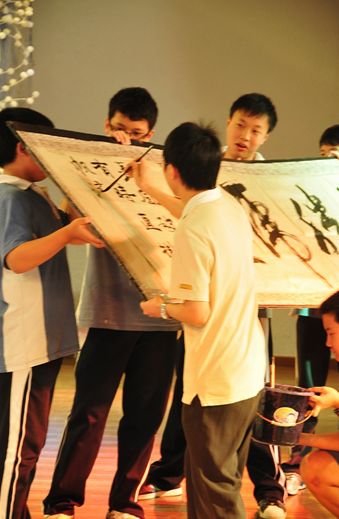 初二(7)班班主任陈国丞老师磅礴大气的现场书法、美术老师亓振国洒脱写意的现场绘画,让同学们惊羡不已、大饱眼福;初一年级语文老师用方言朗诵的《水调歌头》,赢得了同学们的笑声不断;戴月霞、马俊英两位班主任的《好人一生平安》、生活老师肖宇的一首《小白杨》、生活老师刘维的配乐散文《春》等,都让同学们欣喜的看到了老师们多才多艺的另一面;初二全体英语老师的英语儿歌联唱、两位外教与陈东宇老师覃巢老师的吉他弹唱《真心英雄》、初一全体英语老师的服装秀,使现场高潮迭起、掌声阵阵,同学们欢呼雀跃、兴奋不已,最后,展演活动在偶像级歌手付良辉老师的独唱《海阔天空》中结束。