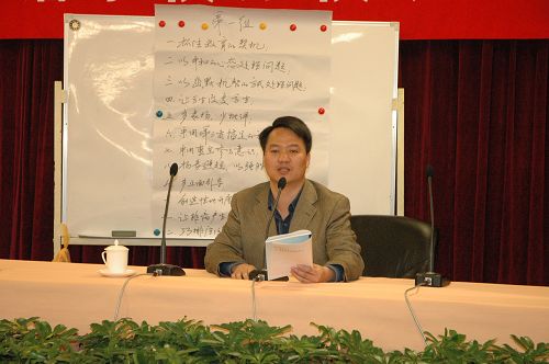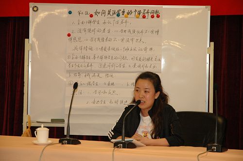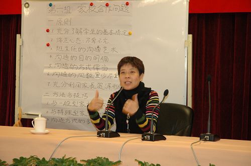 研讨会的第二天上午,通过填空题、单选题、多选题、判断题、论述题等题型的答卷,进行了班主任基本素质测试,接下来就有关“教育艺术”、”如何关注学生的个体差异”、“教师的形象”、“与同伴合作”、“德育活动”、“家校合作”、“班级日常管理技巧”等七个方面的、42个相关问题进行了分组讨论,在热烈的探讨、辩论、达成共识后,分别由袁晶辉、李金玲、王金杰、何永祥、刘启明、张德武等六位老师向大会做了精彩的汇报发言,赢得了一阵又一阵的掌声。