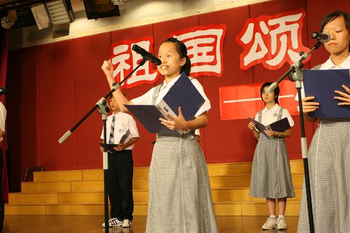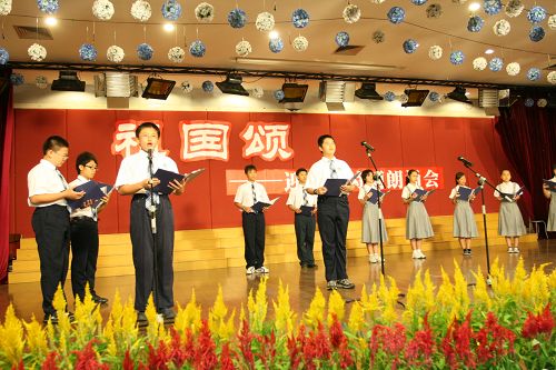 朗诵会上,语文组全体老师分成两个组合,朗诵了《永远的汶川》和《奥运梦想》两首长诗,老师们用一颗感动的心,用一份真挚的情表达了对饱经磨难的祖国的祝福,对历经沧桑的中华民族的深情热爱,也表达了对祖国飞速发展的自豪。由初二学生朗诵的《国殇》,再现了汶川震灾中的一个个悲壮而感人的画面,表达了对灾区人民的深刻同情和支持;初一年级的《古诗词联诵》让我们再一次领略了中国古典诗词的魅力,从唐诗古韵中,我们深为祖国的辉煌灿烂的文化而感动;初三学生朗诵的《祖国,我亲爱的祖国》,从内心深处激荡而出的对祖国诚挚的热爱和作为中国人的自豪深深感染了台下的听众,节目获得了阵阵掌声。