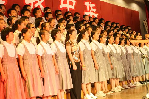 与往届国庆歌咏比赛相比,《国歌》成了每个班的必唱曲目。出于时间考虑,采用灵活的比赛方式:初二年级分班演唱、初一和初三采用现场拉歌比赛方式。比赛间隙,由初一、初三两个年级数百名同学轮流齐唱的《国歌》,洪亮而壮观,将同学们的爱国热情燃至高点。