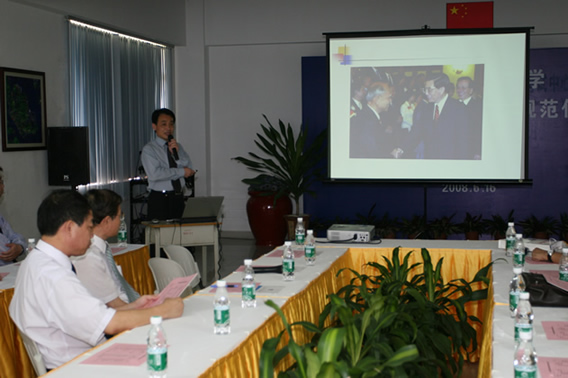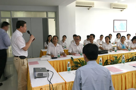 初三教师在英东中学听取了胡国胜副校长关于霍英东先生在南沙远景规划及学校发展历程的报告,并与特聘教育顾问谢锦城博士、黄荣添校长就学校办学思想、培养目标、两校合作等方面作了深入交流。