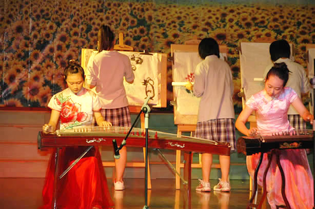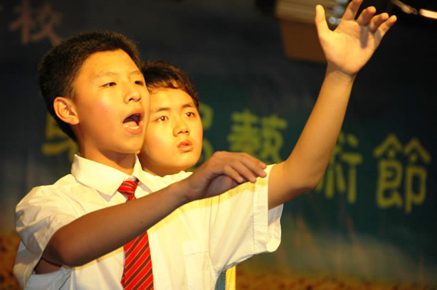 下午14:00,艺术节演出开始,邬校长亲自参与表演了节目诗朗诵《众志成城》,她以饱满的激情表达了对灾区人民的支持与鼓励,对生活继续前行的珍视与祝福,台下观众深受感染。音诗音画《春江花月夜》,十多个学生演员用古筝、毛笔、画笔、水彩等道具从音乐、书法和绘画的不同角度将春江花月夜的美丽、清新、悠远的意境呈现在观众面前,博得了阵阵掌声。民歌联唱、音乐剧《美丽的五彩裙》、英语剧《试镜》等剧目,演绎出了一个个精致的校园艺术生活场面,使每一个观众都为之震撼。