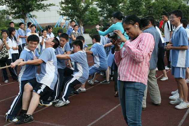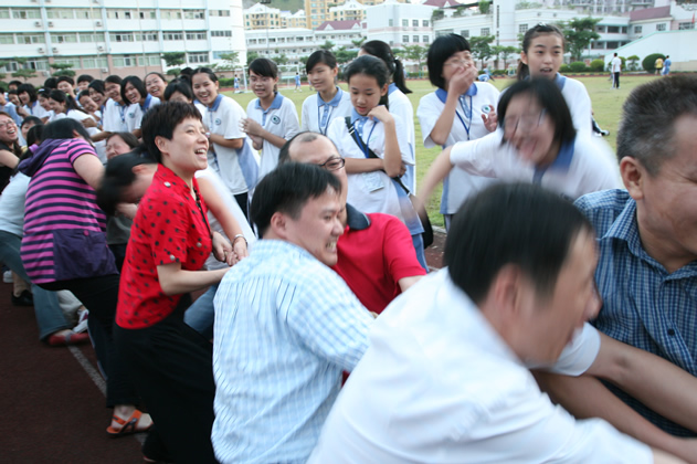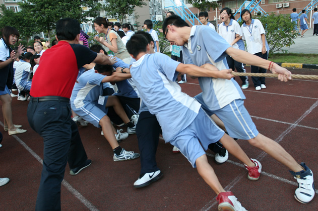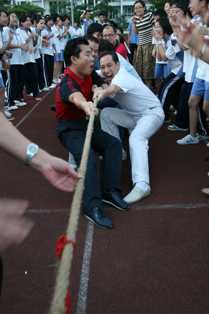 10月9日下午,我校初三年级进行了一次别开生面的师生拔河比赛,由初三年级拔河比赛的冠军班级对阵初三年级的教师队伍。