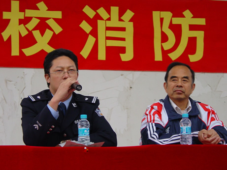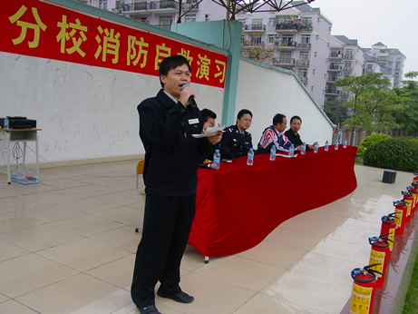 周主任在主席台上指挥消防演习