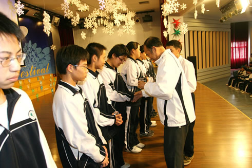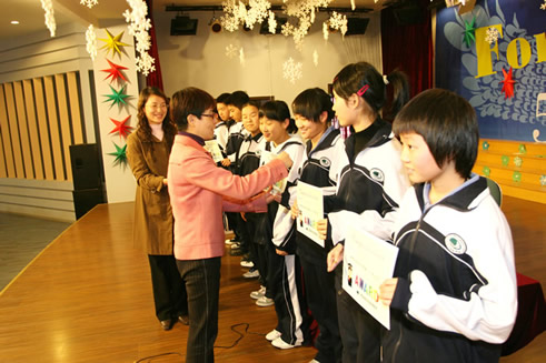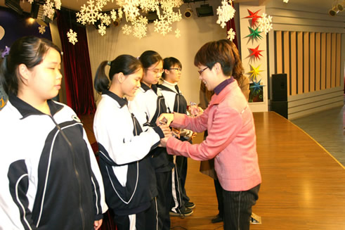 邬校长给初三年级的“诚信之星”同学颁发水晶奖座