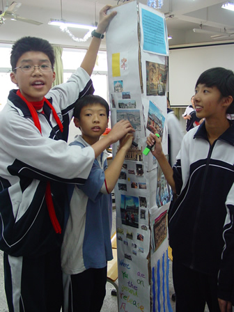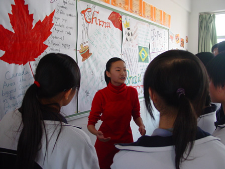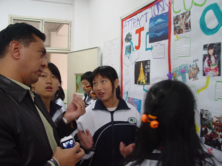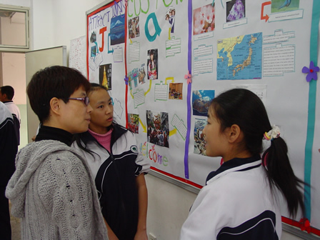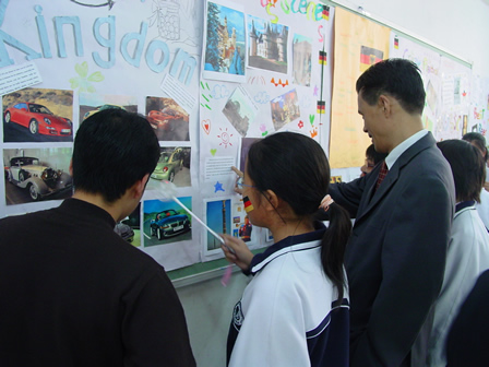 同学用英语向邬校长介绍日本的地理特征