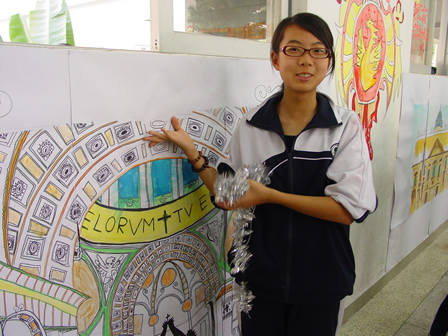同学用英语热情地向参观的老师介绍图画的内容