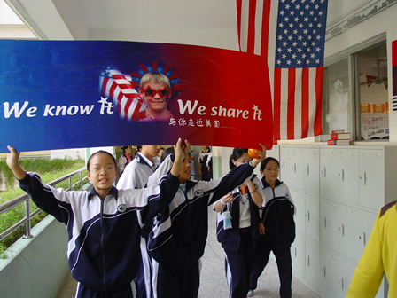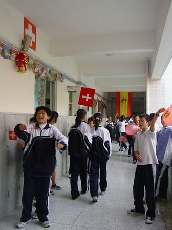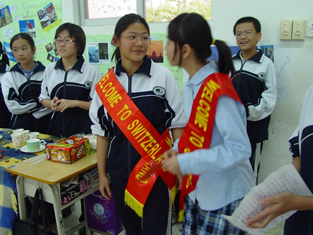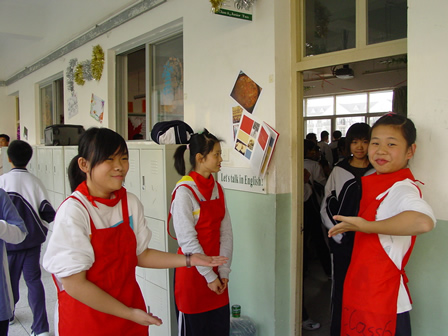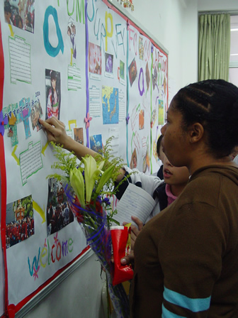 走廊上同学招呼“客人”进本班教室参观