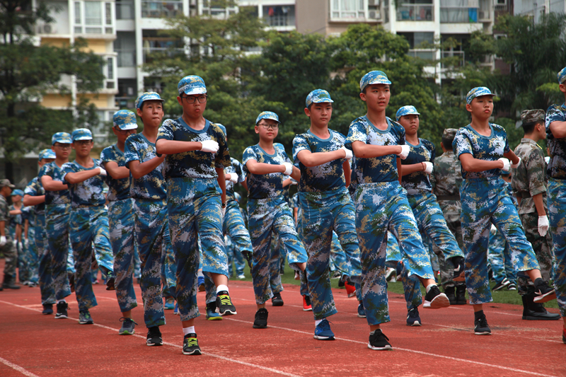 接着是分列式检阅和军训科目汇报表演。军体拳尽显少年活力,气势恢宏;军歌手语操整齐划一,严谨庄严;队列表演迅速整齐,小碎步,立正稍息,跨立、敬礼,每个动作都一丝不苟,令出必行,尽显傲人军姿。
