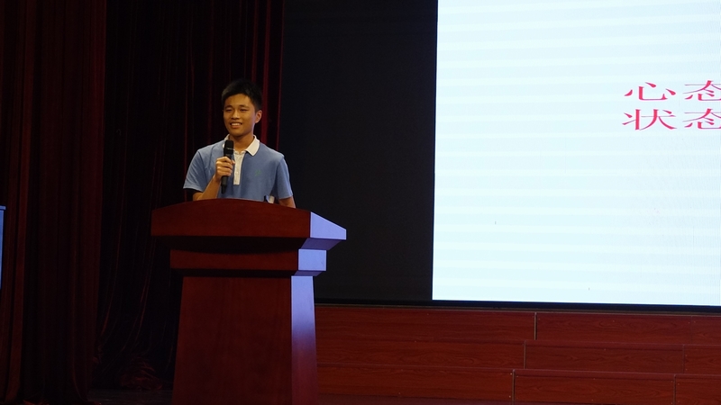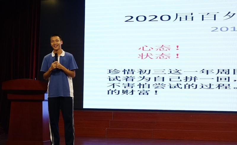 除了老师们的传经送宝之外,现场还邀请了三位优秀学生代表。第一位是陈宗蔚,2019届初三十班班长,百外2019年中考状元。宗蔚同学分享了几个重要的心得,一是如何详细的规划学习,二是怎样认真执行计划,三是心态调整的过程。他还特别强调一定要远离电子产品,心无旁骛,才能有的放矢。第二位优秀学生代表是2019届初三11班的何田鈺同学。他和同学们分享了他是如何从一个年级倒数的孩子一点一点进步,最后突破自我,考上高级。讲解非常生动,引起同学们强烈的共鸣。大家深深的体会到只要有必胜的决心,有坚持的勇气,中考一定是必胜的!第三位上台的是本届初三的优秀学生代表熊昱婷。她用蹦床作为比喻,给大家形象的讲解了考试要成功所需要的各种因素,尤其强调了积极的心态在长期应试中的重要作用。